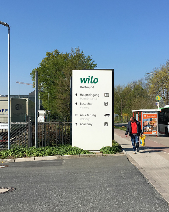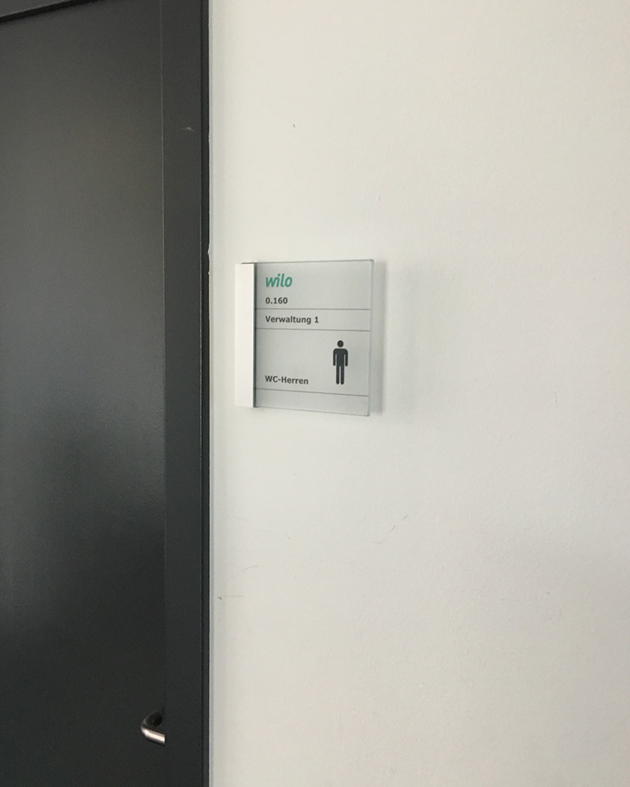 Implemented across Wilo headquarters in Dortmund, serving thousands of employees daily. System designed for scalability to international locations. Project documentation: www.mehnertdesign.de/en/arbeiten/wilo-signaletik