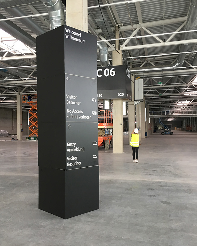 The system adapts the same geometric form across radically different contexts. A cube at desk height guides visitors to meeting rooms. The same form at three meters marks parking zones. Wall-mounted versions direct traffic in production halls. The visual language stays consistent while the scale shifts.