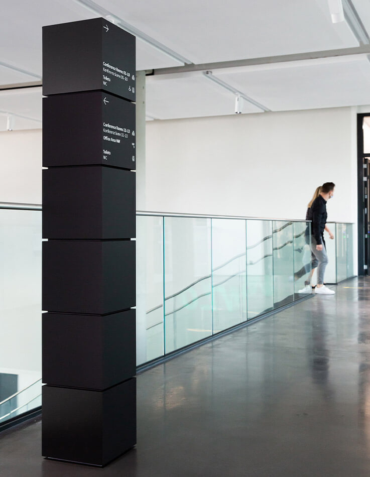 Modular wayfinding system for Wilo SE’s global headquarters and international locations, using a black cube as scalable core element.